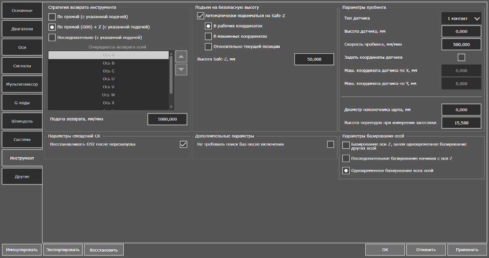 Вкладка настроек "Инструмент" содержит в себе дополнительные настройки программы и станка, связанные с поведением режущего инструмента.